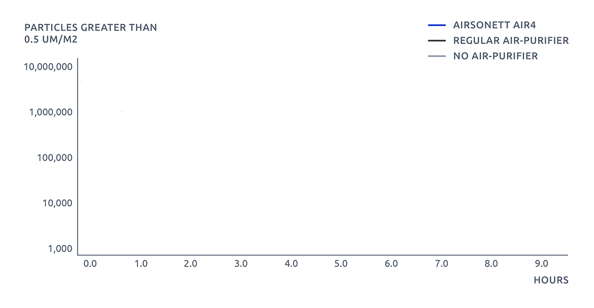 Airsonett Air4 is the only solution that eliminates 99.5% of allergens, dust, bacteria, pollen, pet particles, viruses and other airborne particles in the breathing zone. In clinical trials, TLA has proven to be one hundred times more effective compared to air purifiers.
