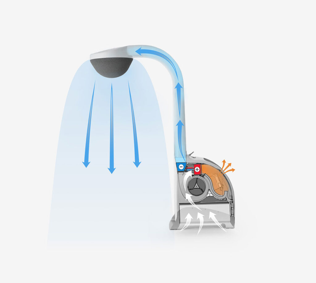 Airsonett Air4 uses the patented TLA technology (temperature-controlled laminar airflow) to direct a soft flow of filtered, clean, lightly cooled air toward the breathing zone. The filtered, clean air is slightly cooled before it is released from the unit, so that it sinks gently due to gravity and pushes away the particle- and allergen-rich air from the breathing zone.